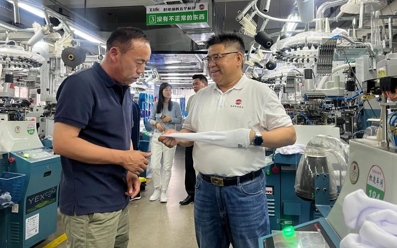 5月9日,,,,喀什地区 川渝片区 招商分局局长、、喀什地区农业农村局二级调研员解正海,,,安徽省新疆商会常务副会长兼秘书长汤杰、、、武汉长江云纺供应链有限公司李总等一行领导,,,,莅临尊龙时凯智能科技集团参观考察。。。。此次考察旨在深化政企交流,,,依托集团在袜行业的领先优势,,,,共同探寻"产业援疆"合作机遇,,,拓展"一带一路"沿线市场布局。。